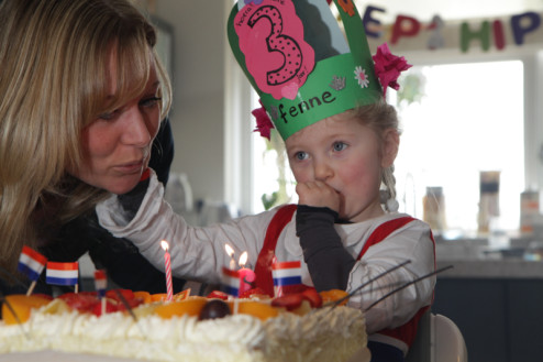 Mama en Fenne waren eergisteren en gisteren jarig en dat vierden we vandaag. Het was gezellig druk met familie en vrienden. Fenne glunderde bij alle cadeautjes! Samen met mama blies ze de kaarsjes op haar Sneeuwwitje-taart uit, dat was wel spannend. Maar de taart was erg lekker!