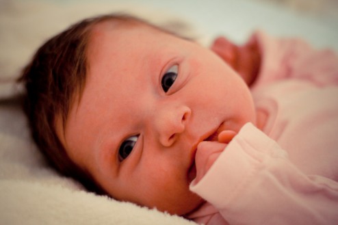 Fenne ligt geduldig te wachten totdat mama haar helemaal klaargemaakt heeft om in bad te gaan…