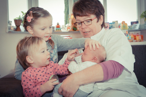 Onze kraamhulp Marij heeft toevallig bij alle drie de meisjes mogen helpen. Natuurlijk wilde we een foto van Marij en de meisjes.