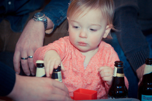 Spelen met bierflesjes Ninte lvdlaar 1 februari 2015 Tijdens de kraamvisite van onze vriendengroep vermaakt Ninte zich prima met de bierflesjes en dopjes.
